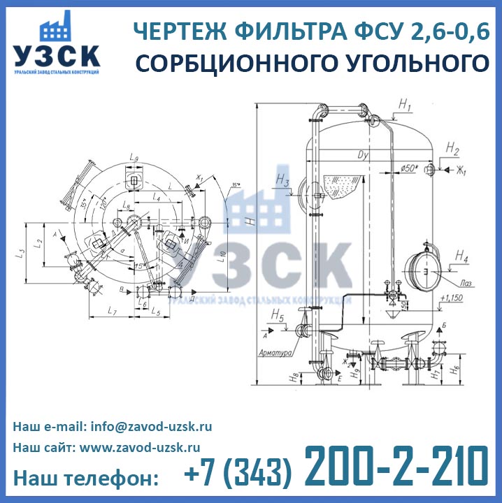 Изготовление сорбционных угольных фильтров ФСУ 2,6-0,6 в Нарыне осуществляется из стали. Корпус аппарата представляет собой цилиндрическую обечайку из стального листа с приваренными к ней сверху и снизу штампованными днищами эллиптической формы. Для монтажа на фундамент, фильтр оснащен тремя опорами. Для присоединения трубопроводов обвязки в центре днищ имеются фланцы. Корпус аппарата снабжен двумя люками-лазами, необходимыми для загрузки сорбента, осмотра, ремонта и обслуживания фильтра. Внутри фильтра расположены нижнее сборно-распределительное устройство (НРУ) и верхнее (ВРУ).